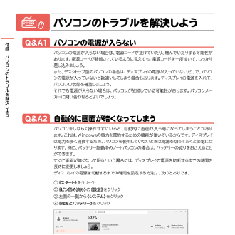 「パソコンの電源が入らない」「画面が固まって動かない」など、よくあるトラブルの対処法を紹介しています。いざというときも落ち着いて対応できます。