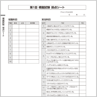 3回分の模擬試験には採点シートが付いています。採点シートには実技科目の採点ポイントとなる項目を記載しています。これらの項目をチェックすることで、見逃しがちな設定や覚えていない操作を確認できます。