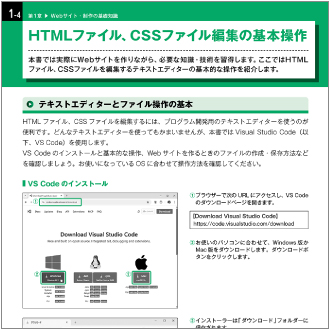 HTMLやCSSのコードを入力・編集する際は、プログラム開発用のテキストエディターを使用すると効率的です。本書では、Webサイト制作で広く利用されている「Visual Studio Code」(VS Code)の基本操作を紹介しています。学習段階から操作に慣れておくことで、試験対策だけでなく、実務でも活用できます。